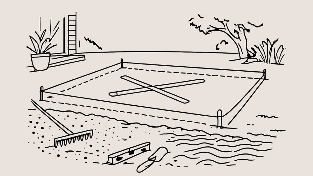 Begin met het bepalen van de plek van je composiet vlonder. Span een touw om de vorm uit te zetten en markeer de hoeken met piketpalen. Zo werk je straks nauwkeurig en voorkom je meetfouten.